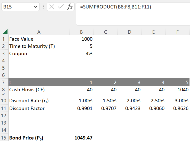 The SUMPRODUCT function below calculates the bond price by multiplying the sums of cash flows and discount factors for each year t (CF1 * Discount Factor1 + CF2 * Discount Factor2 + … + CFT * Discount FactorT).