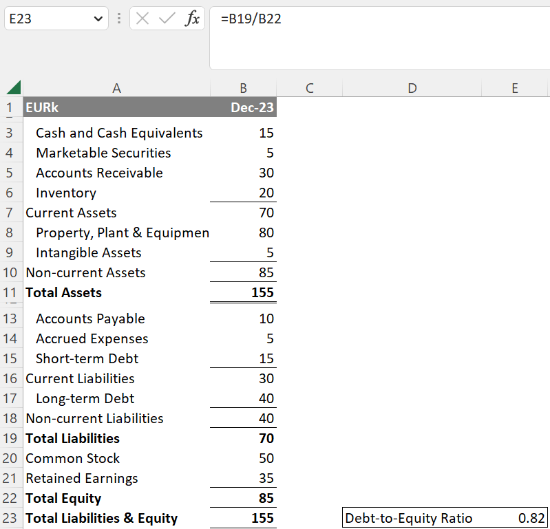 To calculate the Debt-to-Equity Ratio in Excel, you will use a simple division formula.