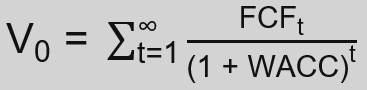 The DCF model determines the total value of the firm (V), provided one utilizes free cash flow to the firm (FCFF) and the weighted average cost of capital (WACC). To derive the value of equity (A), subtract the net debt (ND) from the firm’s total value.