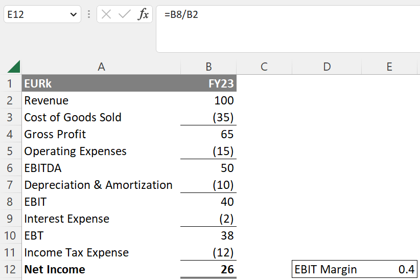 To calculate the EBIT Margin in Excel, you would typically use the following formula: EBIT / revenue. In the example below, EBIT is recorded in cell B8 and the Revenue is in cell B2.